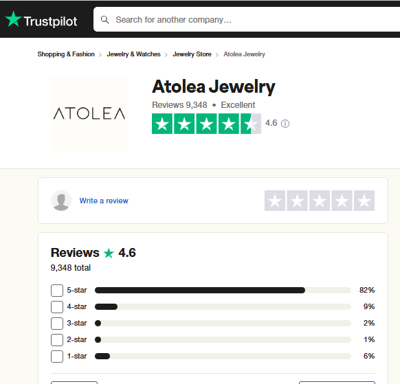 Atolea Jewelry has 9,348 reviews and with an average rating of 4.6 on Trustpilot. It has mixed reviews on Trustpilot.