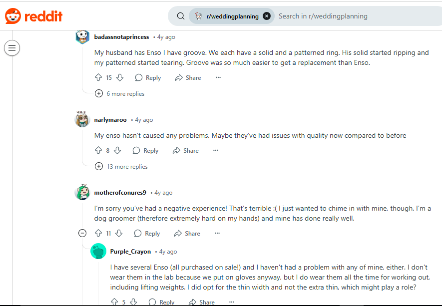 Redditors generally praise Enso Rings for its stylish, affordable designs and good customer service, though some raise concerns about the durability of its gold-plated pieces for daily wear.